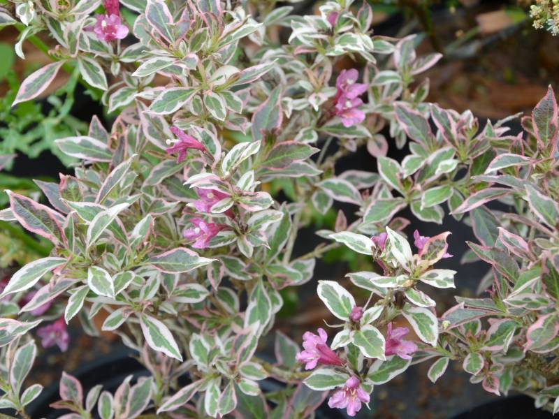 'Monet' ist eine kompakt und niedrig wachsende Zwergweigelie mit mehrfärbigem Laub. Das Blattwerk ist bräunlich-dunkelgrün mit einer cremeweiß-rosafarbenen Umrandung. Die rosafarbenen Blüten ergänzen die Pracht des Zierstrauches von April bis Mai.